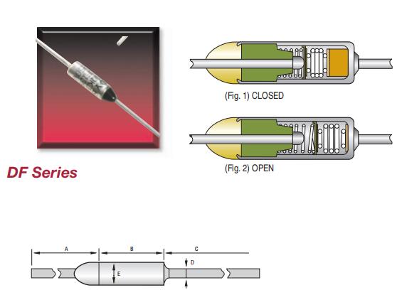 The Thermal DF Series Thermal Cutoffs are single action devices that open when a preset temperature is reached. They do not reset. The active component of a ther- mal cutoff is an electrically insulated thermal pellet. This pellet holds a spring loaded contact against a fixed contact under normal operating temperatures. (See Fig. 1) When the preset temperature of the cutoff is reached, the pellet liquifies, the springs relax, and the spring loaded contact is moved away from the fixed contact, opening the circuit. (See Fig. 2) The DF Series is the right choice for applications requiring an inexpensive limit protector with 15A capability.