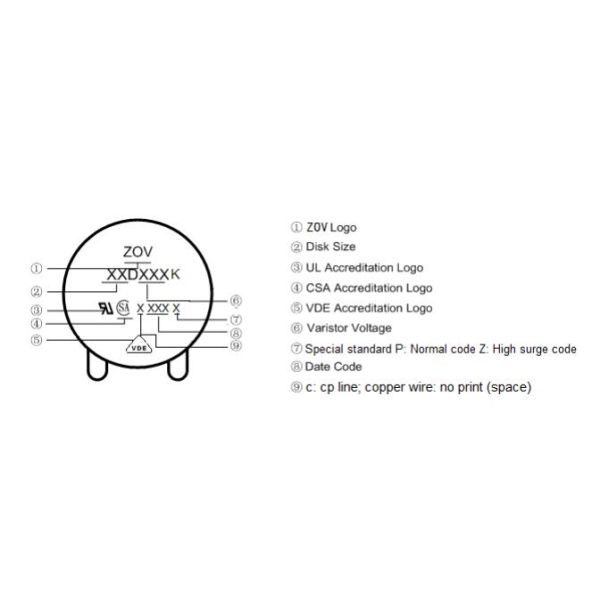 | ZOV Part Number | Maximum Allowable Voltage | Varistor voltage | IR3 | @ | Clamping volatge | Maximum Peak Crurrent (8/20μs) | Maximum Ebergt 10/1000μs | Reted Power | Typical Capacitance (Reference) | |||||||||||||||||||||||